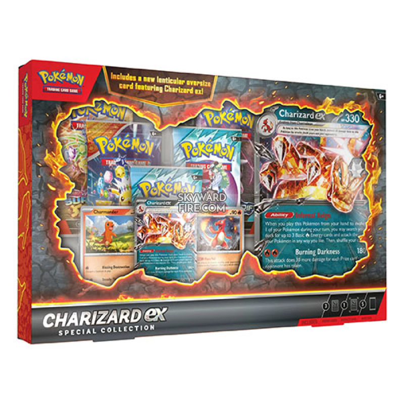 Charizard ex burns up the opposition’s lead with the cunning firepower of a Darkness-type Pokemon! Evolve it from Charmander and Charmeleon, then use its strong ability and attack to make a roaring comeback. This fiery set also comes with 5 Pokemon TCG booster packs and an oversize lenticular card featuring the Flame Pokemon itself – move the card back and forth to see Charizard ex go on the attack!