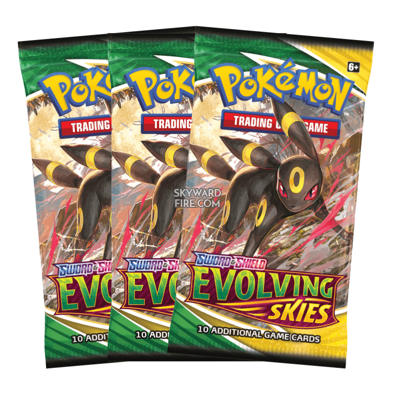 Feel the power of the shifting winds, and brace for an epic storm as mighty Dragon-type Pokémon make their triumphant return! Rayquaza VMAX leads the surge from on high, and Duraludon VMAX towers above the land in its Gigantamax form, joined by Dragonite V, Noivern V, and more. As the clouds part, Eevee's Evolutions appear in a full rainbow of Pokémon V and Pokémon VMAX to signal a bright new day in Pokémon TCG: Sword & Shield—Evolving Skies!