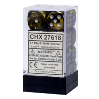 CHESSEX DICE: 16mm D6 Dice Block: Leaf Black Gold / Silver (12 DICE)