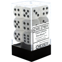 CHESSEX DICE: 16mm D6 Dice Block: Frosted Clear / Black (12 DICE)