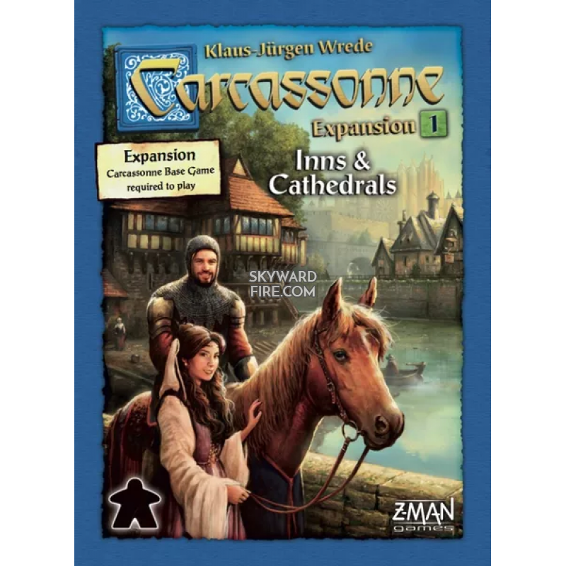 Carcassonne: Die Erweiterung (later prints used the title Inns & Cathedrals) is the first major expansion for Carcassonne and introduces a few new aspects to the game. There are a couple of completely new kinds of tiles - the inns and cathedrals. There are also new tiles that present cities, roads, and cloisters in new shapes. Additionally, each player gets a "big meeple" which counts as two regular meeples. Another whole set of meeples means 6 players can now enjoy the game. Finally, a set of scoring cards helps make score-keeping a little clearer.