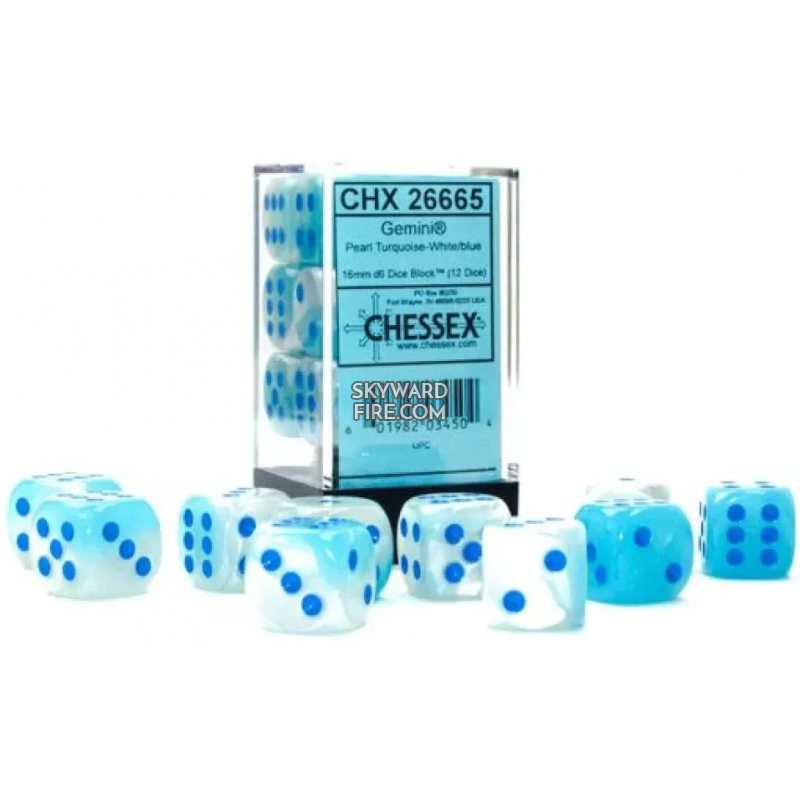 Gemini Pearl Turquoise - White / Blue (12mm Set Of 36 Dice Block) CHESSEX DICE