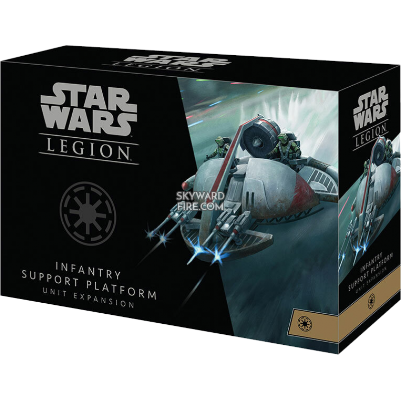 This expansion contains one finely sculpted Infantry Support Platform miniature along with everything you need to add it to your Republic armies as a heavy unit. The miniature itself can be assembled with either standard Clone Scout Trooper Pilots, or 327th Star Corps Elite Armor Pilots. Additionally, you're free to choose the weapons mounted on the front of your Infantry Support Platform, including Twin Blaster Cannons, Twin Missile Pods, or Twin Beam Cannons. All of these visual touches are brought to life in-game by a unit card and seven upgrade cards that invite you to outfit the Infantry Support Platform to fit your strategy. Fight your foes anywhere with the Infantry Support Platform Unit Expansion