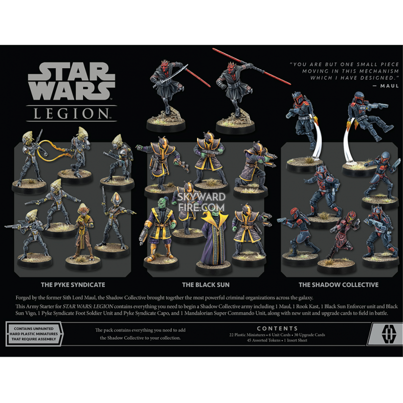 Whichever path they choose, this set gives players plenty of new options for building their armies with 22 miniatures, including Maul, a unit of Shadow Collective Mandalorian Super Commandos, a unit of Black Sun Enforcers, and a unit of Pyke Syndicate Foot Soldiers. Additionally, players can further customize these forces with 30 upgrade cards that unlock heavy weapons, characters like Rook Kast, and more. Finally, this set also includes three command cards for use with the new mercenaries, three new command cards for Maul, and reprints of Maul’s three Separatist Alliance command cards.