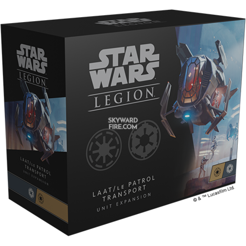 Within this expansion, players will find everything needed to add a LAAT/Ie Patrol Transport to their Republic or Imperial armies. The beautifully detailed, unpainted hard plastic miniature can be assembled with either Phase II clone pilots or Imperial TIE pilots, and unit cards for both factions help players fully integrate them into their forces. In addition to these cards, 12 upgrade cards invite players to customize their LAAT/Ie with unique pilots from both factions as well as ordnance and comms systems.