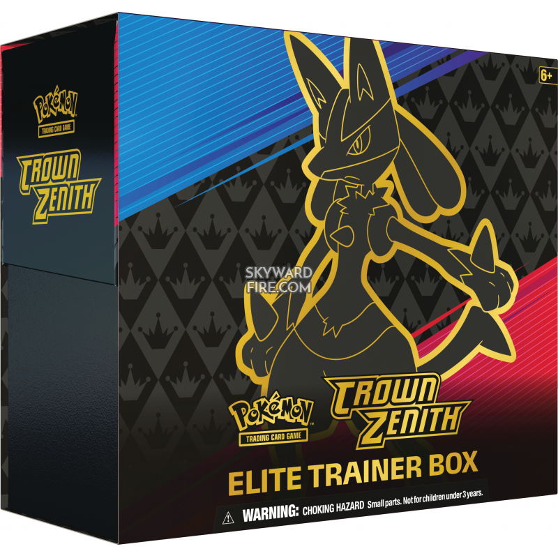 Crown Zenith Elite Trainer Box (available January 20, 2023): Includes 10 Crown Zenith booster packs, one special art card featuring Lucario VSTAR and various gameplay accessories