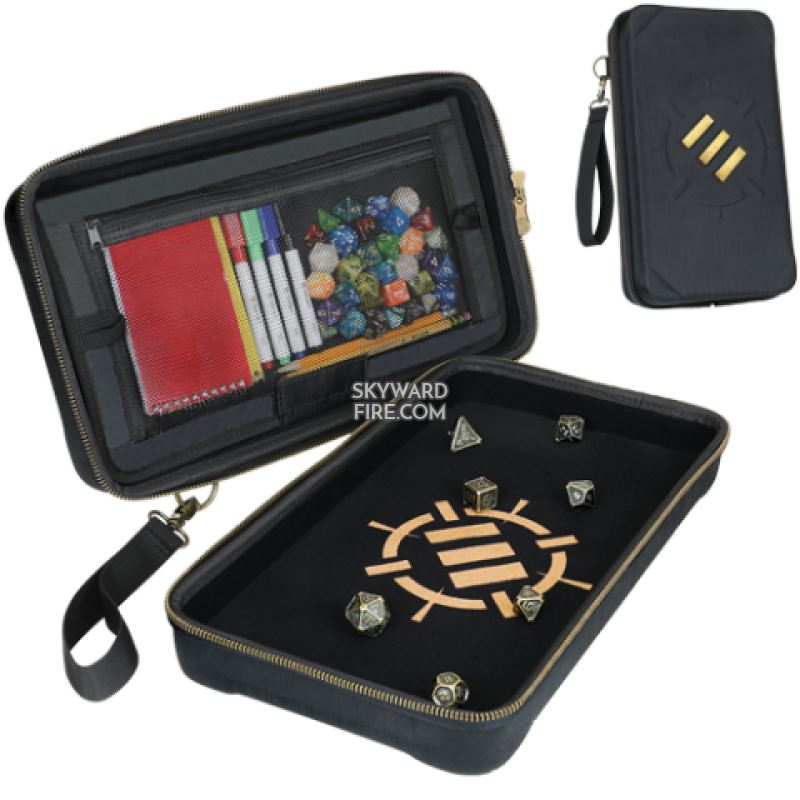 Beautifully designed with embossed decals and stylish bronze accents, the Community Dice Holder is the perfect 3-in-1 DnD dice rolling and storage solution. It features a built-in dice rolling tray with high walls to keep dice in, organization for 150+ dice on the detachable Dice Repository, which comes with multiple compartments and a large zippered pocket, and total storage space for up to 500+ dice. The dice holder case also features a hand strap for easy transport as you go on your next adventure.