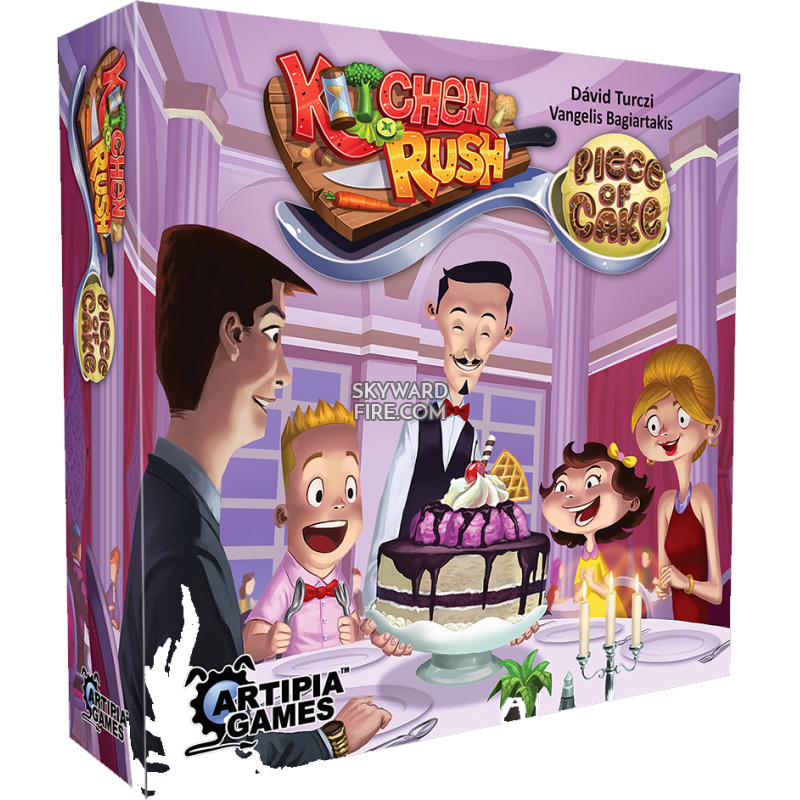 Piece of Cake, an expansion for Kitchen Rush, adds a new type of order with desserts, ice-cream mini-orders, two new ingredients (crème and fruit with custom-shaped wooden tokens), and a new type of token (ice cream scoops). An extension to the game's board introduces additional actions for the players, and there is also a 60" hourglass for a specialist worker who can perform improved versions of the available actions.