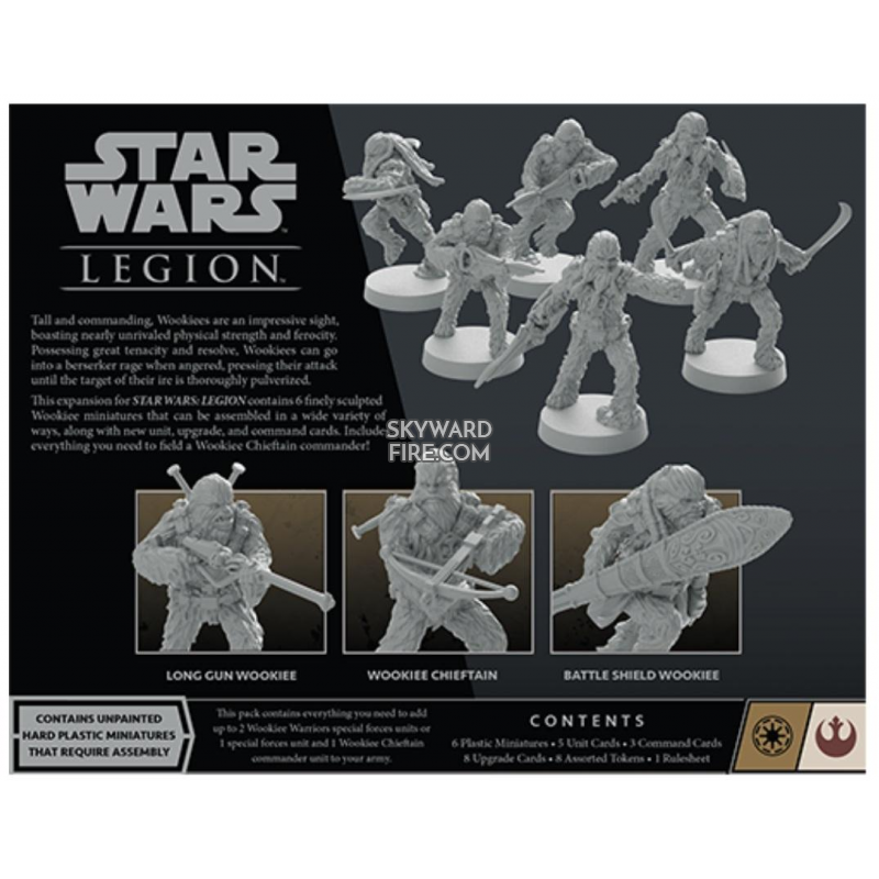 The Wookiee Warriors Unit Expansion puts six Wookiee Warrior miniatures that can be assembled and used in a variety of ways at your command, including as either a close-range unit carrying ryyk blades and Kashyyk pistols or a unit of Wookiee sharpshooters firing X1 Carbines. No matter how you assemble your miniatures, four upgrade cards invite you to field these units for both the Republic and Rebel factions. Additionally, a miniature representing a Wookiee Chieftain can enter the fight as a Republic commander and a fifth unit card and three command cards let them further influence your strategy. Finally, eight upgrade cards invite you to customize your units with Wookiees carrying an array of weaponry.