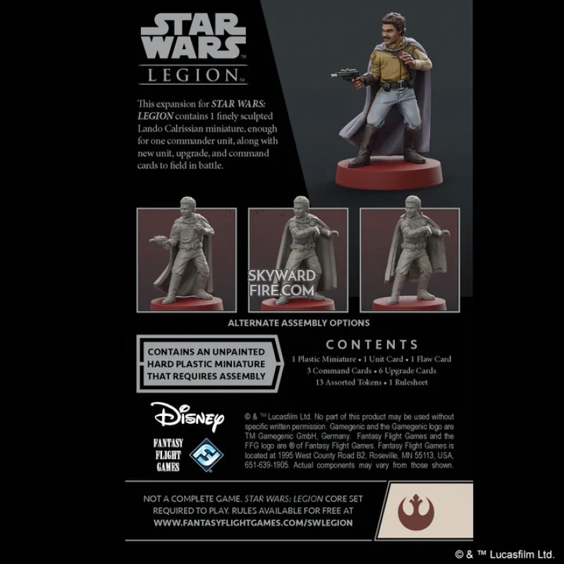 This expansion contains everything you need to add Lando Calrissian as a commander of your Rebel armies, beginning with a beautifully sculpted, unpainted hard plastic miniature that reflects Calrissian’s unique sense of style. Not only will you find three different options for his signature cape, you’ll also be able to choose between two facial expressions and whether or not Calrissian appears reaching for his X-8 Night Sniper Pistol in its holster or has it at the ready.