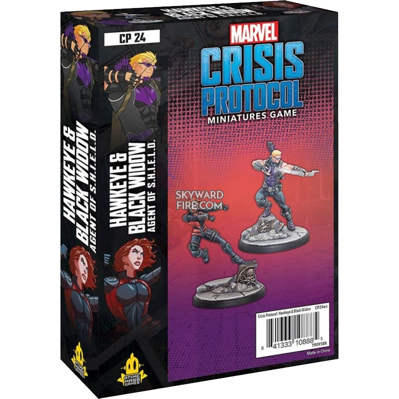 Marvel: Crisis Protocol – Hawkeye & Black Widow contains a miniature of each character, two character stat cards, two team tactic cards, and ten tokens.