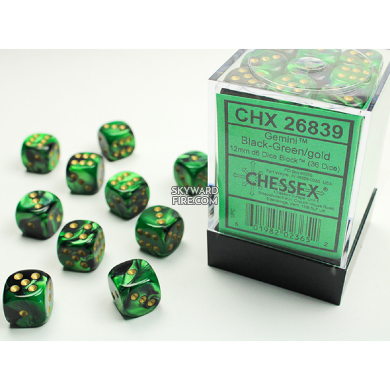 Chessex - Gemini 12mm D6 Dice Block - Black & Green w/Gold