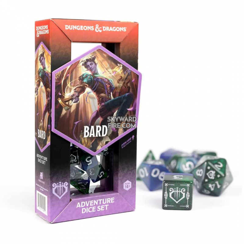 Inspire your party with the officially licensed Dungeons & Dragons Adventure Dice Set for Bards. This stylish blue set captures the charm and creativity of the Bard, with dice perfectly suited for casting spells, performing inspiring songs, and weaving illusions. Whether you’re bolstering your allies or beguiling your enemies, these dice will add flair to every performance, making your Bard the star of any campaign.