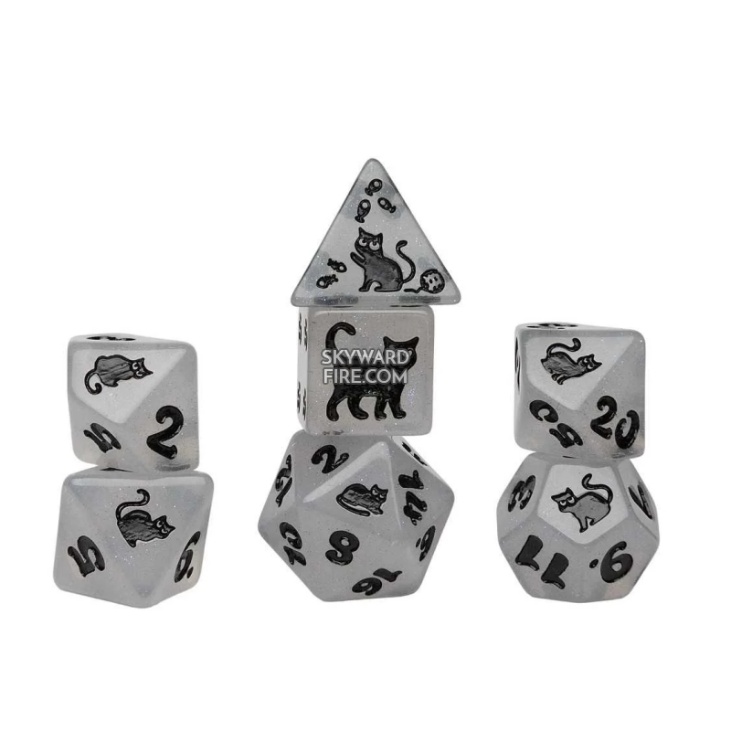 Meet Shimmerpaw—where feline charm meets tabletop gaming! This enchanting gray polyhedral dice set captures the grace of cats. Whether you're embarking on epic quests, settling board game showdowns, or crafting your next adventure, these dice deliver both style and reliability. The soft gray palette with luminous accents makes every roll feel magical. Perfect for players who appreciate a little purr-sonality at the table!