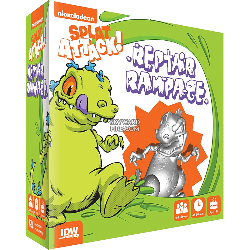 Just when you thought it as safe to return to the cafeteria, Reptar crashes the party! In Reptar Rampage, an expansion to Nickelodeon's Splat Attack!, Reptar joins the food-fight fray as an uncontrollable beast of destruction! Attempt to defeat Reptar by teaming up and splatting him with food, but be careful! Every successful hit causes Reptar to rampage, stomping across the board! if you get stomped on, then Reptar eats your points! The player with the most points by the time Reptar is defeated wins the game!