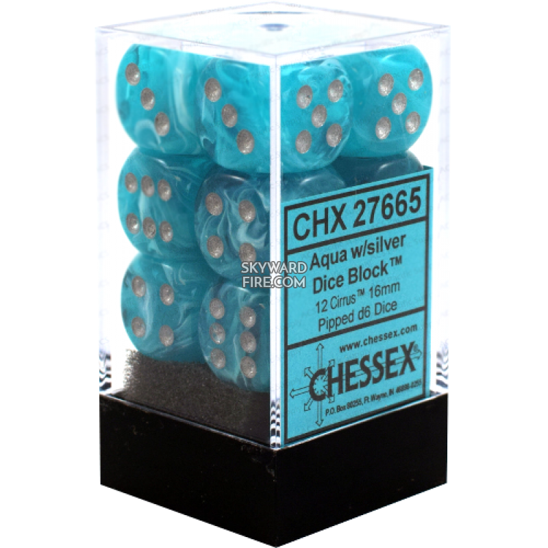 CHESSEX DICE: 16mm D6 Dice Block: Cirrus Aqua / Silver (12 DICE)