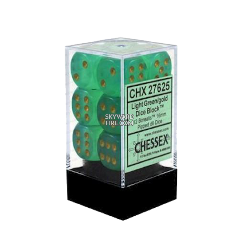 CHESSEX DICE: 16mm D6 Dice Block: Borealis Light Green / Gold (12 DICE)