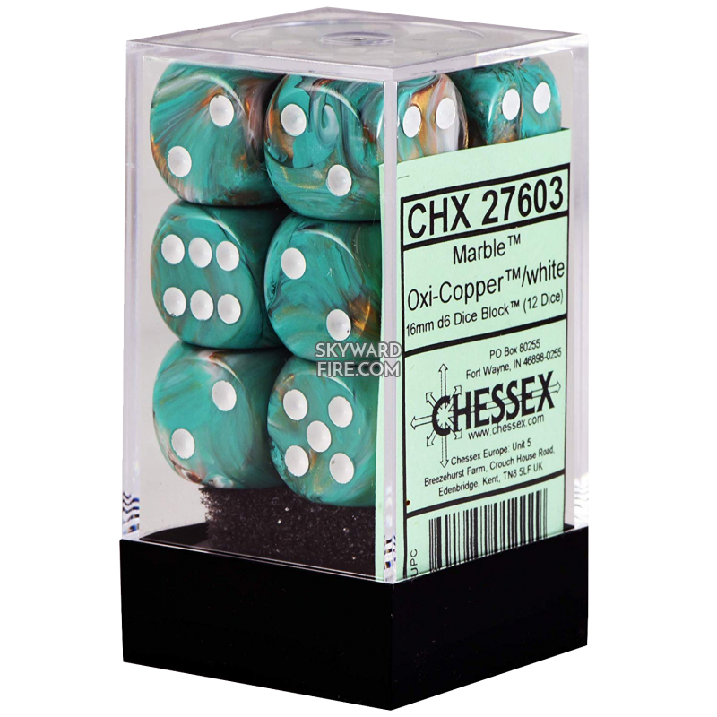 CHESSEX DICE: 16mm D6 Dice Block: Marble Oxi-Copper / White (12 DICE)