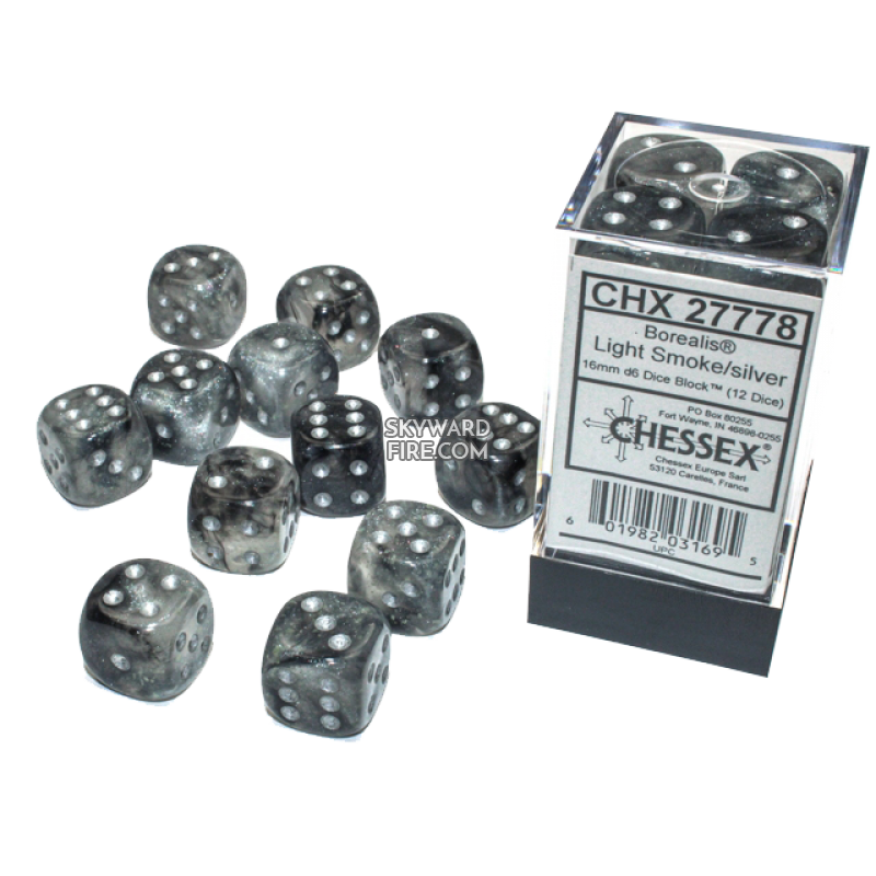 CHESSEX DICE: 16mm D6 Dice Block: Borealis Light Smoke / Silver (12 DICE)