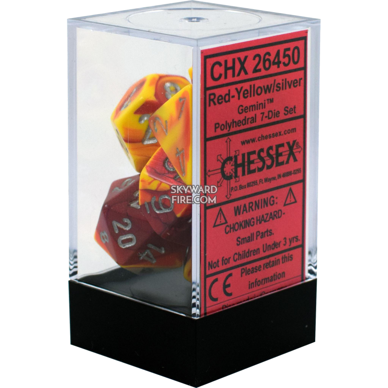 CHESSEX DICE: Polyhedral Set Of 7 Dice Block: Gemini Red-Yellow / Silver