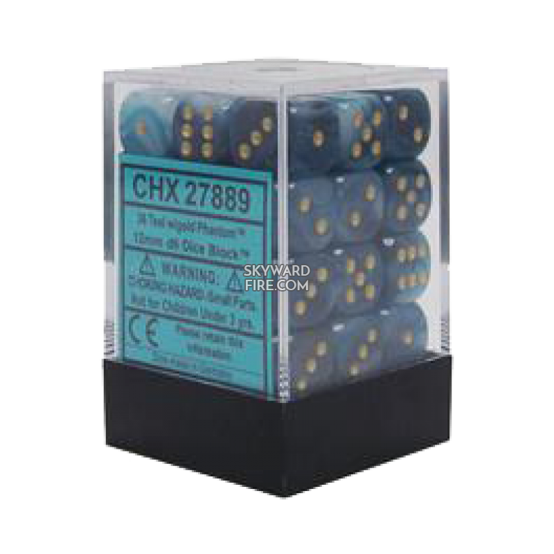 CHESSEX DICE: 12mm Set Of 36 Dice Block: Phantom Teal /Gold