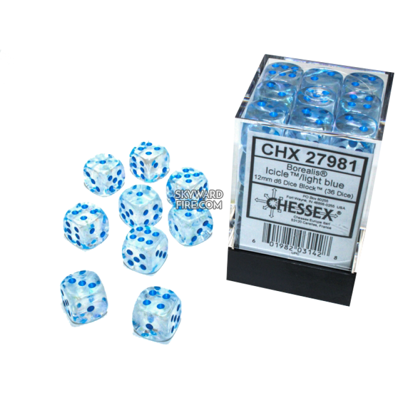 CHESSEX DICE: 12mm Set Of 36 Dice Block: Borealis Icicle / Light Blue
