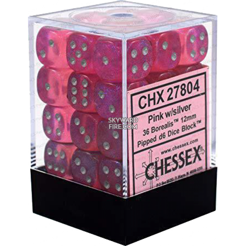 CHESSEX DICE: 12mm Set Of 36 Dice Block: Borealis Pink /Silver