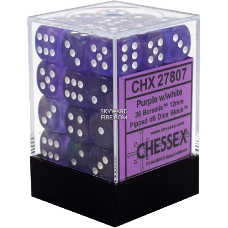 CHESSEX DICE: 12mm Set Of 36 Dice Block: Borealis Purple / White