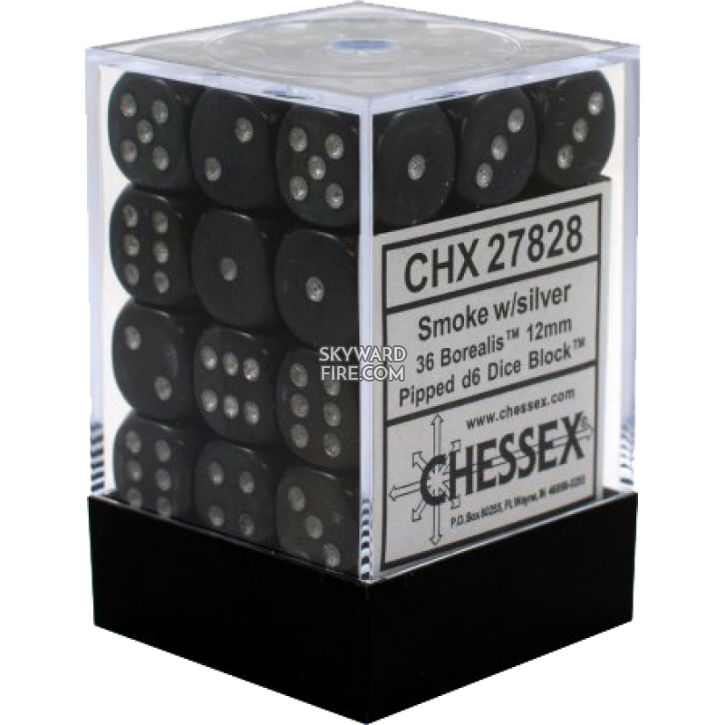 CHESSEX DICE: 12mm Set Of 36 Dice Block: Borealis Smoke / Silver