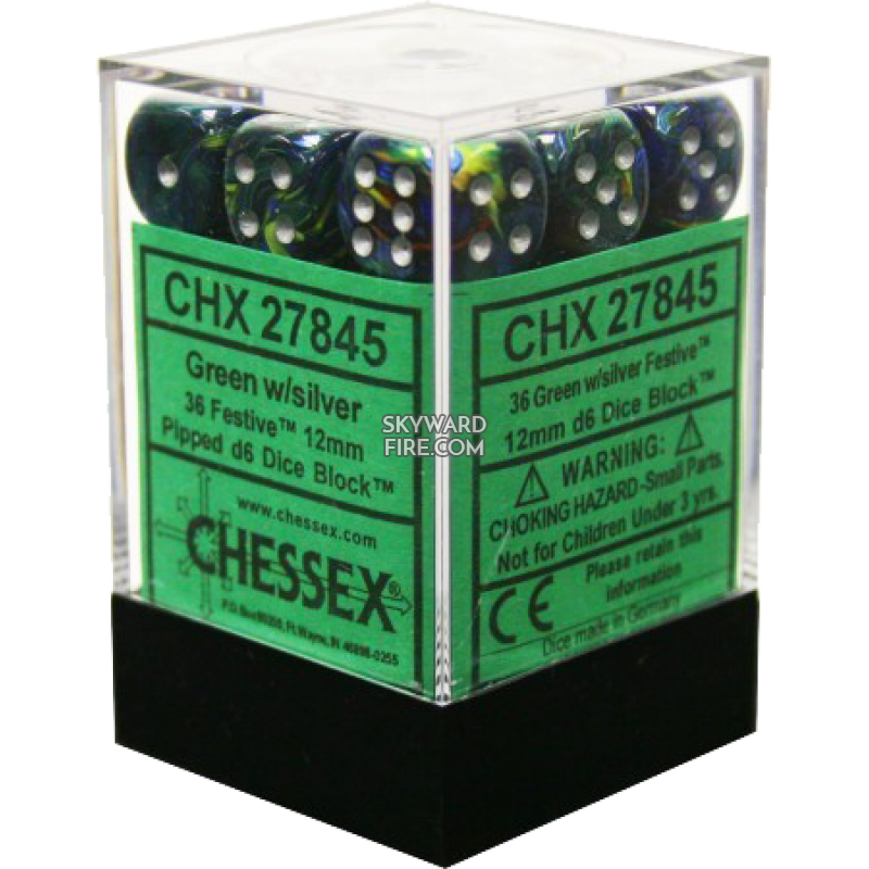 CHESSEX DICE: 12mm Set Of 36 Dice Block: Festive Green / Silver