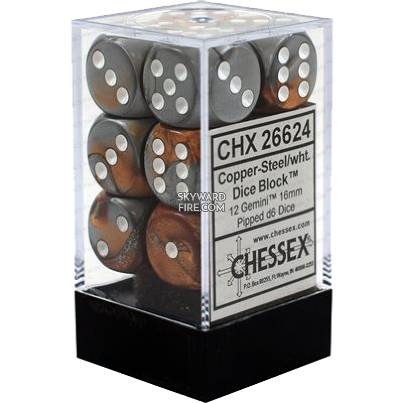 CHESSEX DICE: 16mm D6 Dice Block: Copper-Steel / White (12 DICE)