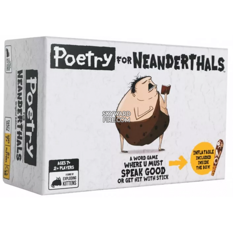 Poetry for Neanderthals is a competitive word-guessing game where you can only give clues by speaking in single syllables. So, instead of saying "broccoli," you'd say something like "green thing you eat for live long and have good health." If you mess up and use a big word, such as "vegetable," you get bopped on the head with a NO !Stick and you lose points.