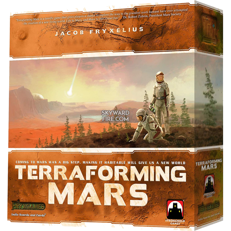 In the 2400s, mankind begins to terraform the planet Mars. Giant corporations, sponsored by the World Government on Earth, initiate huge projects to raise the temperature, the oxygen level, and the ocean coverage until the environment is habitable. In Terraforming Mars, you play one of those corporations and work together in the terraforming process, but compete for getting victory points that are awarded not only for your contribution to the terraforming, but also for advancing human infrastructure throughout the solar system, and doing other commendable things.