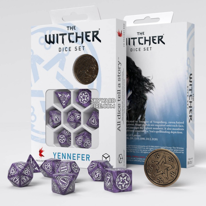 Inspired by the Witcher franchise, this set of seven high-quality polyhedral dice comes with a metal coin featuring a depiction of the sorcerer Yennefer.