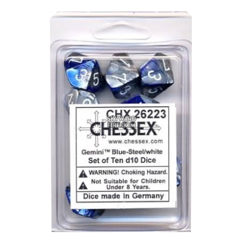 CHESSEX: Gemini Blue-Steel / White Set Of Ten D10 DICE