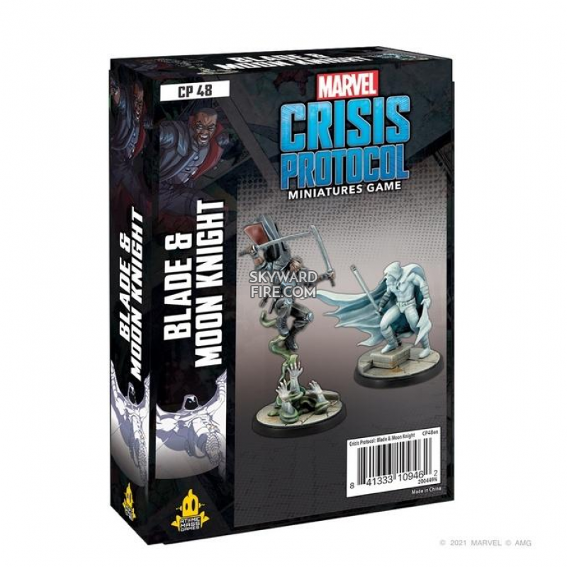 This Marvel Crisis Protocol pack contains one Blade Miniature, one Moon Knight Miniature, two bases, two Character Stat Cards, three Team Tactic Cards and eleven tokens.