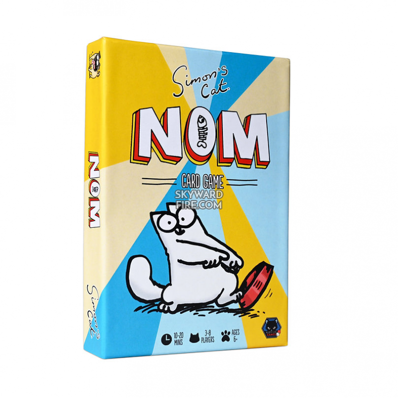 NOM is a fast paced and portable game where players are trying to play and get rid of their hand of cards! Players take it in turns, but be sure to pay close attention, at any moment someone might play the NOM card beginning a race to slam your hands on the table with the slowest player feeling the wrath….. of Simon’s Cat!