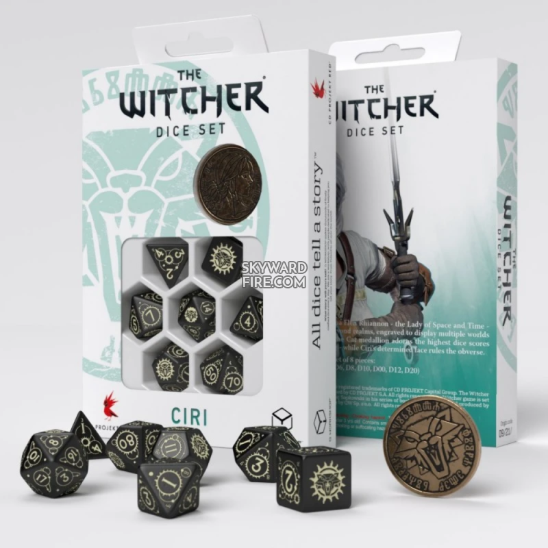 A sword and a symbol. Inspired by The Witcher franchise, this dice set is dedicated to Cirilla Fiona Elen Riannon, who had a sword named Swallow - Zireael in Elder Speech. The set contains 7 polyhedral dice, and a metal coin featuring Ciri's depiction. Each die has black material with pale yellow engravings. The highest value faces, and coin reverse, are adorned with the School of Cat symbol.