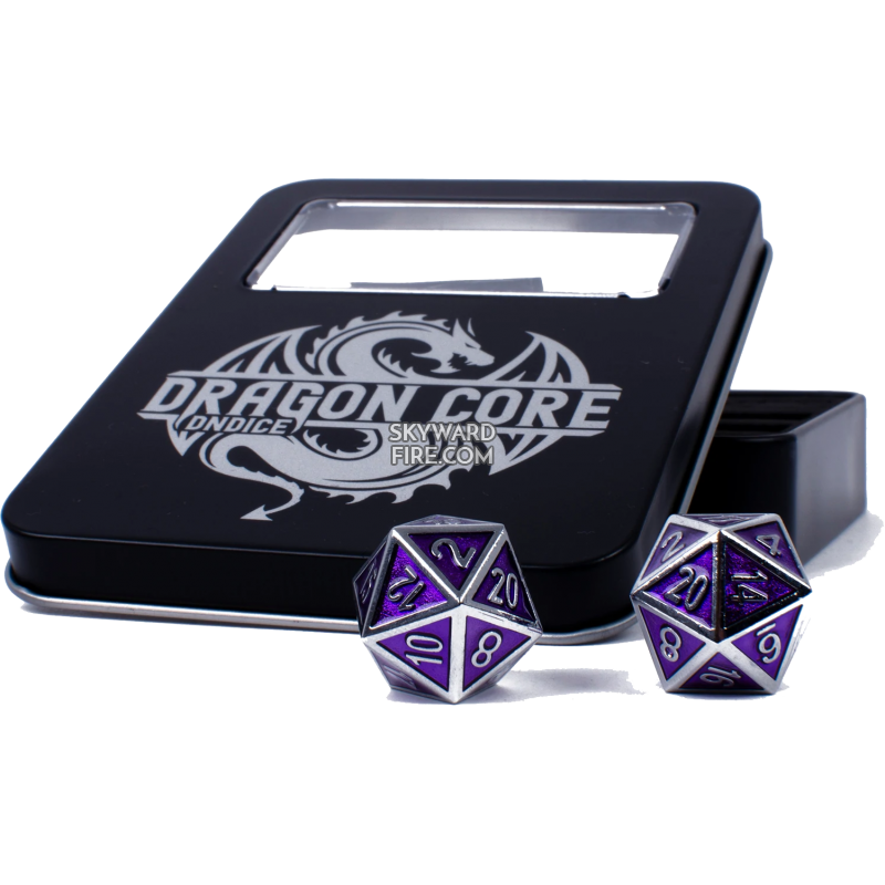 This set comes in the 8 piece poly set needed for D&D and other RPG systems: a 2d20's for advantage, a d12, a d10, a d8, a d6, a d4, and a percentile die in a custom-crafted metal storage tin complete with heavy-duty protective foam to keep them safe when not battling evil!