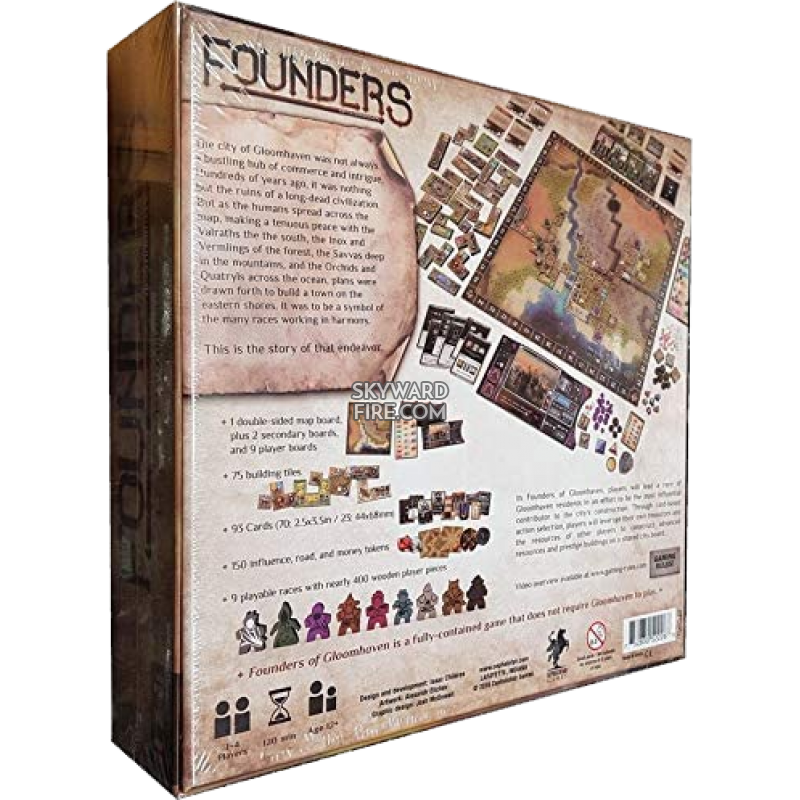 Founders of Gloomhaven is a competitive tile-placement, action-selection, city-building game in which each player controls a fantastical race working to build the city of Gloomhaven and gain influence over its residents. This is a standalone game set in the same universe as Gloomhaven. The events, however, take place hundreds of years before Gloomhaven and depict the original construction of the city.
